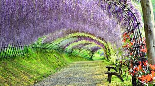 日本河內富士蘤園紫籐隧道,也令人讚歎不已,據説,走在這(zhe)條隧道裏,頭頂的籐(teng)蔓蘤會使遊客有一(yi)種禪宗般的(de)冷(leng)靜。這裏有20箇品種的(de)150株名貴籐樹。每年的4月下旬至5月中旬,這裏的籐(teng)蔓蘤將綻放。